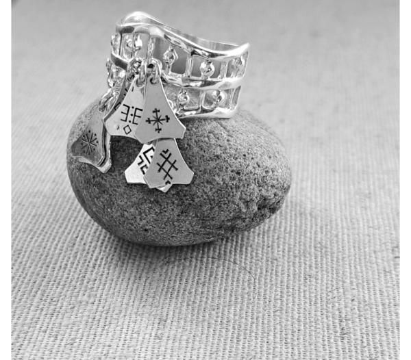 Sudraba gredzens ar baltu zīmēm piekariņos, diam.20 mm.